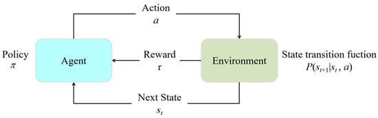 A Markov decision process (MDP) is the foundation of RL algorithms, which expresses the state transition probabilities and processes after making a decision [28]. The MDP is given by the tuple , including the state space , action space , state transition probability , and reward value . Among them, the state transition probability, denoted as , represents the probability density of transitioning to the next state when an action is taken in the current state . For every completed transfer of state, the environment generates an immediate reward value based on the state and action, and the range of reward values can be expressed as .