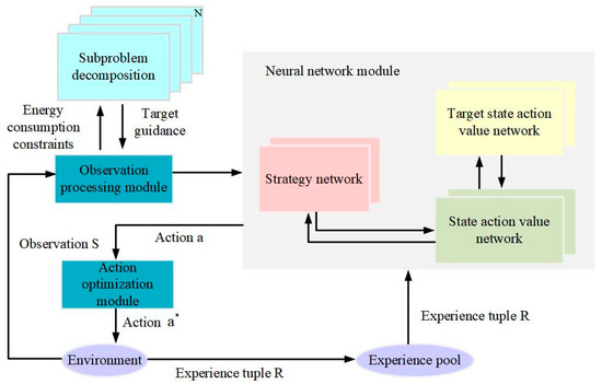 The information of the observation processing module is inputted into the neural network module, which includes the state action value network , the target action state value network , the policy network , and the target policy network , with the corresponding network parameters being , respectively. The updated observation space input target strategy network with maximum reward expectation, the target strategy network, is expressed as: