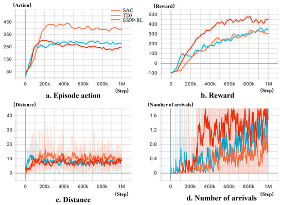 Sufficient training and experiments have been conducted on the SAC, TD3, and ESPP-RL algorithm. Since the training is an oscillating process, in order to better visualize the training results, appropriate smoothing processing is carried out. The training process is recorded in Figure 4, where Figure 4a represents the average number of actions of the algorithm in the training process, Figure 4b corresponds to the reward value of the UAV in a round, Figure 4c reflects the average distance of the UAV in each round, and, finally, Figure 4d represents the average number of target points that the algorithm can reach in the environment.
