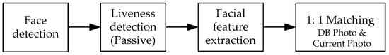Face recognition is a type of biometric recognition technology that extracts facial features from photos and videos taken based on AI deep learning technology, stores them in a database, and verifies identity by comparing the saved photo with the current photo [15,16,17,18,19,20]. Since it is a non-contact method that does not require human contact, it is hygienic and convenient, making it the simplest and most efficient security system.