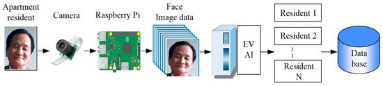 The proposed system consists of a Raspberry Pi and a camera system using IoT, and EVAI applies facial recognition technology using OpenCV and classifies elevator occupants. Classified face information for each elevator user is stored and then searched and recommended by EVAI. EVAI automatically stores facial images and elevator usage information taken when the resident last used the elevator the day before. It is used for facial recognition and automatic selection of the destination floor the next day. Figure 3 and Figure 4 show the process by which EVAI collects, stores, and classifies facial images and movement information of high-rise apartment residents.