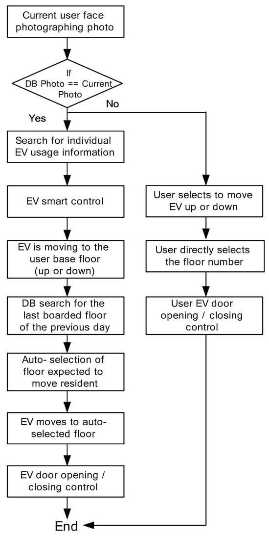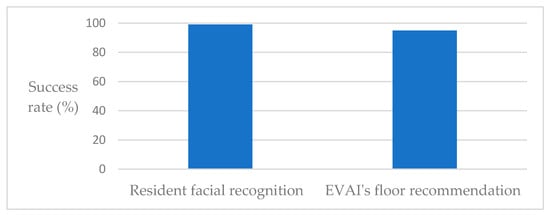The EVAI floor recommendation classification results are shown in Table 6. If there are 12 instances of EVAI recommendation failure for each of the 240 residents, the failure rate is 5%. EVAI verifies the resident through facial recognition when the resident returns home, stores the floor the resident moves to in a database, and automatically recommends the floor the resident moves to the next day when the resident goes out and uses the EV. In addition, when the resident goes out, the floor the resident moves to is stored, and the floor the resident moves to is automatically recommended when the resident returns home and moves the EV. Suppose 12 cases of failure occur each among 240 residents using EVs during morning rush hour; in that case, the recommended fail rate of EVAI, which has learned the latest EV usage information of residents, is 5%.