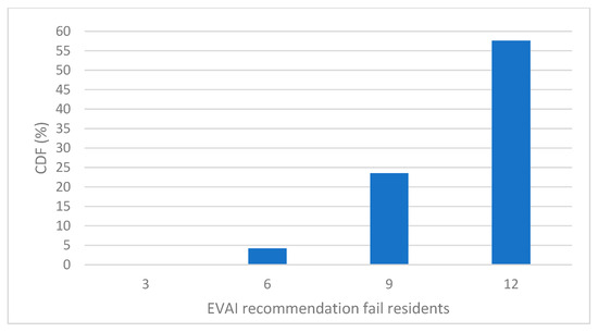 The experimental results are shown in Figure 9, and the average reduction time of total travel time (waiting time) of the EV was reduced by 6.3 s. Because it compares the latest resident data photos with real-time photos, the resident face recognition rate was 99%, and the resident floor recommendation success rate was 95%. The probability of failure of EVAI recommendation for 240 residents was calculated using the cumulative distribution function (CDF) (Equation (5)) based on the binomial distribution, and the results are shown in Figure 10. If there are 6 or fewer residents among 240 who fail the EVAI recommendation, the probability is 4.2%.