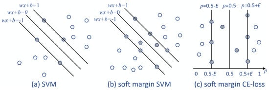 Inspired by soft margin SVM, the proposed soft margin CE loss can identify support vectors and non-support vectors. Furthermore, soft margin CE loss meets the general requirements of classification tasks and can be used for multi-label and multi-classification tasks. In classification tasks, classification methods based on neural networks usually output a prediction, ranging from 0 to 1, to represent the activity probability of one class. In this process, the neural networks can be regarded as non-linear kernels of SVM, which map the samples into a feature space, where samples satisfy linear separability. Based on this, as shown in Figure 2c, the activity probability for the sample is in the range of [0, 1] (). Analogous to SVM, we assume that the separating hyperplane is , which is used to judge whether an event occurred.