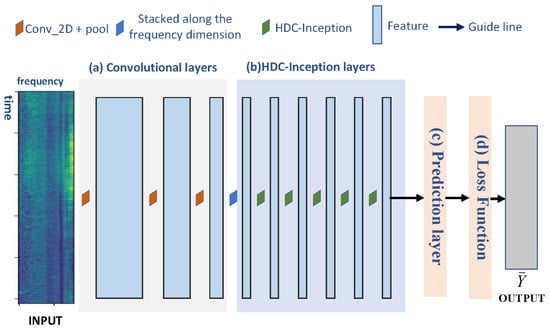 Employing HDC-Inception, along with soft margin CE loss and hybrid CE loss, forms the core of the proposed methodology. As shown in Figure 4, the proposed method consists of three parts: (1) Convolutional layers used to obtain features with frequency invariance, (2) HDC-Inception layers, which can model temporal context and capture long short-term dependencies, and (3) loss functions, under which CE loss, soft margin CE loss, and a hybrid loss function that combines both are selected. Next, we will go into detail about each of the three parts.