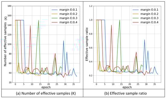The difference between soft margin CE loss and CE loss causes this degradation. Observing Figure 3, CE loss can be regarded as a special soft margin CE loss with . So, the differences between soft margin CE loss and CE loss are their different points of convergence. CE loss converges to 1 or 0, and soft margin CE loss only requires samples to meet or . In soft margin CE loss, when the output p of a positive sample satisfies , or p of a negative sample meets , the partial derivative is equal to 0. Therefore, this kind of sample is not valid for training and is called the non-support vector. It is known that training a neural network requires a large dataset. However, when soft margin CE loss is used, although the training of support vectors is well noticed, this loss function can cause many samples to become non-support vectors prematurely, which is detrimental to the training. In the task of audio signal detection–classification, the input is a continuous sequence of Mel spectra, represented as , where T = 256 denotes the sequence length. In this experiment, this X will be noted as a support vector, if one element of X is a support vector. Figure 6 presents the number of support vectors and the ratio in the dataset after each epoch. Observing Figure 6, the proportion of support vectors is about 25% in the later epochs. In this experiment, the batch size is 256, and considering the support vectors, the effective batch size is about 256∗0.25 = 64. Note that not all elements work in a support vector (X); thus, the actual number of effective samples is extremely low. To address this problem, this paper proposes the hybrid CE loss, which can use all samples to train the network while focusing on the support vector.