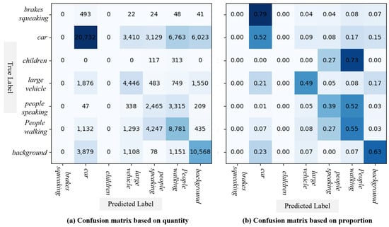 In order to present the results comprehensively and compare the misclassification of different categories, confusion matrices based on quantity and proportion are constructed as shown in Figure 7. When constructing the confusion matrix, the segment lengths are set to 1 s, as segment-based metrics. As shown in Figure 7, for the brakes squeaking event, all samples are misclassified, with 79% of them being misjudged as the car. This result is similar to that obtained by the dataset developers, where the ER for the brakes squeaking was 98% and the F1 score was 4.1% [58], nearly a complete misclassification. Analyzing the reasons, as shown in Table 1, the brakes squeaking event has 52 samples with a total duration of 96.99 s, and only about 70 s is selected during the training process, resulting in an extremely small total duration for this event. Moreover, car engine running and car idling were also labeled as the car event. It is evident that car engine and car idling events have a high similarity to brakes squeaking, which is also the cause of the misjudgment. For the car event, the accuracy is relatively high. For the children event, all samples are misclassified, with 73% being misjudged as people walking. This result is similar to the dataset developers’ findings, where the ER for children was completely wrong and the F1 score was 0 [58]. The Car event has the second shortest duration of 350.99 s. Beyond that, during dataset partitioning, the authors divided children yelling and children talking into the children category, which also led to the majority of children samples being misclassified as people speaking and people walking. For the large vehicle event, the proportion of correct judgments is 49%, while the proportions of misclassifications as car and background are 21% and 17%, respectively. It is understandable that large vehicle and car events have a high similarity. For people speaking and people walking, the proportions of correct judgments are 39% and 55%, respectively. The two categories have a relatively high mutual misclassification rate, as it is common for people to walk while talking or talk while walking. For the background event, the proportion of correct judgments is 63%, with 23% misclassified as the car event. Overall, the proportions of misclassifications as car and people walking events are relatively high, due to the longer total durations of these two events on the training dataset, as car has the largest duration of 2471.14 s and people walking has the second-largest duration of 1246.95 s. Therefore, the primary reasons for the model’s misjudgment are inferred to be class imbalance and inter-sample similarity.