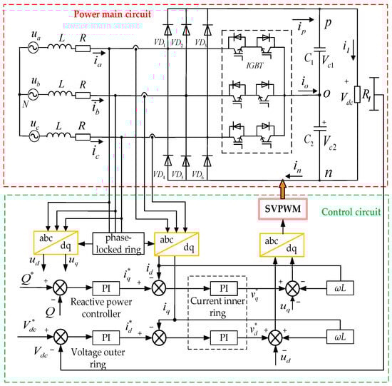 Figure 1 depicts the three-phase Vienna rectifier, comprising two main components: the main power circuit and control circuit , , and , , denote the grid-side voltage and current, respectively, while L and R represent the grid-side filtering inductance and resistance. denotes the six fast-recovery diodes. The bi-directional switching tubes are composed of two IGBTs with continuous current diodes in reversed series. The upper and lower filter capacitance and on the DC side are identical. represents the equivalent load, with indicating the flow current and the DC output voltage. and refer to the positive and negative currents on the DC side of the common bus, respectively, and denotes the current flowing into the midpoint of the DC-side filter capacitor. The control circuit utilizes a double closed-loop PI strategy based on voltage vector orientation. and represent the system voltage and reactive power control quantities, respectively, while , , , , , and denote specific control parameters.