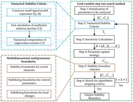 The stability boundary analysis method of the Vienna rectifier proposed in this paper is shown in Figure 2, which mainly includes two parts: the numerical stability criterion and the stability boundary search. In the numerical stability criterion part, the system small-signal (8) is first obtained according to the topological structure characteristics of the Vienna rectifier. Then, the redundant terms of the non-state variables in (3) and (4) are eliminated, and the system cycle stability solution is obtained through (25)–(27) to obtain the system state variables , , , , and , and these computational results are brought into (9) to obtain the coefficient matrix. Further, (38) and (39) are used for the numerical computation of eigenvalues and stability judgment. In the stable boundary search part, the grid variable step search method used mainly includes the initialization of analysis parameters, sensitivity calculation, search step adjustment, and search stopping criterion.