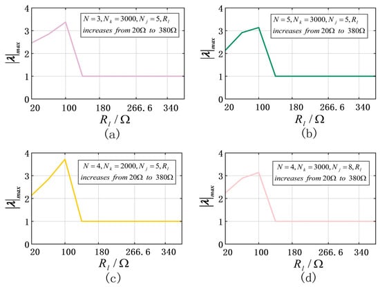 Using the proposed numerical stability criterion depicted in Section 1, the coefficient matrix is constructed using the harmonic balance method and (9). The time-varying state transfer matrix is computed according to (38), and is calculated using (39). The calculation results of the eigenvalues for the rated parameters, under load variations ranging from 20 to 380 Ω (, , and ), are shown in Table 2. Based on Table 2, the trajectory of under different values of is plotted, as illustrated in Figure 3. The plot indicates that the stability boundary of is near 140 Ω under the rated parameters.