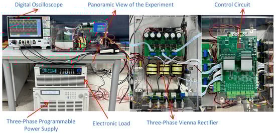 Based on the parameters shown in Table 1, this paper builds a Vienna rectifier hardware experimental platform, as shown in Figure 4, which adopts the TMS320F28335PGFA (Texas Instruments, Dallas, TX, USA) as the main control chip and realizes the SVPWM-based voltage-current double-closed-loop PI control strategy. The network side power supply adopts Chroma61705 (Chroma, Shenzhen, China), the load adopts Chroma63203A (Chroma, Shenzhen, China), and TekMDO34 (Tektronix, Beaverton, OR, USA) is used to demonstrate the waveforms. Using the above experimental platform, this paper presents a comprehensive analysis of theoretical calculations, simulation results, and experimental verification of the load stability boundary, circuit component stability boundary, and control parameter stability boundary of the Vienna rectifier, which proves the correctness of the proposed stability boundary calculation method.