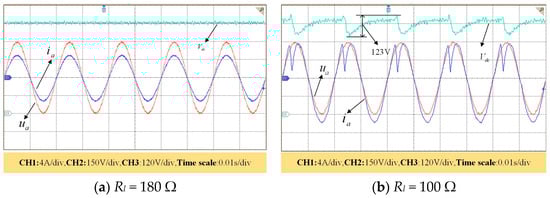 According to Figure 3, the theoretical stability boundary calculated by the proposed method for the load under the rated parameter shown in Table 1 is . To verify the correctness of the load stability boundary calculation, the Chroma63203A is used to set equivalent resistance values above () and below this stability boundary (), with the results of the experimental waveforms with different loads shown in Figure 5. When , the DC bus voltage cannot stabilize at the target value of 600 V, with the ripple reaching a maximum of 123 V, significantly higher than the normal ripple. Conversely, when , the Vienna rectifier maintains a stable bus voltage with minimal ripple. The stability results obtained by the above experiments are consistent with the stability boundary obtained by the proposed method, which indicates that the proposed method has the capability of load stability boundary analysis.
