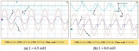 To further verify the correctness of the stability boundary analysis, this paper randomly selects a stable boundary point of L from Figure 6 (marked by a brown box Ver) and takes values of and to confirm the results. At those operating points, the experimental waveform of the hardware platform is shown in Figure 7. The system remains stable when the inductor is below the boundary point . However, when it exceeds the boundary point , the DC bus voltage fails to reach the target value of 600 V, and the ripple increases to 185 V, leading to system instability. These results indicate that the multi-parameter stability boundary of L, as determined by the proposed method and simulation analysis, is consistent with the physical experimental results. This demonstrates that the proposed method can effectively calculate the stability boundary of the circuit component L in the Vienna rectifier under the multi-parameter variation. Similarly, this method can be applied to calculate the stability boundaries of other components in the Vienna rectifier circuit, which will not be repeated here.