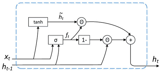 In Equation (2), and (j = ) are parameter matrices. The activation for the gates usually uses logistic sigmoid to constrain the value of gates within . For each dimension of information, a gate of value 0 means that the gate is “closed”, and 1 means that the gate is “fully open”. For example, of value 0 forces the model to discard any input information in time t, and of value 1 allows the model to keep all previous memories. The value of each gate is determined during training by the current input and hidden information. A tanh nonlinearity is applied when computing and , while ⊙ indicates the element-wise product.