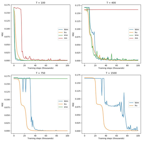 RNN models included in this test are basic RNN, LSTM, IRNN, and the proposed LRU. Four different sequence lengths——are tested. For all models, one hidden layer of 100 neurons is used. The optimizer is SGD with an initial learning rate of and a momentum of 0.9. No learning rate decay is performed. Gradients are clipped when they exceeded 10 to avoid gradient exploding. A mini-batch of 32 is used to accelerate training. Processing a mini-batch is referred to as “a training step” in this test for simplicity. The model performance is evaluated on a validation set of 100 mini-batches every 1000 training steps. Training stops after processing 100,000 mini-batches. Both the training and validation data are randomly generated after each model evaluation.