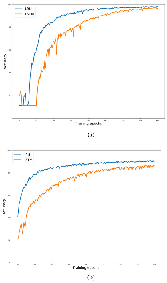 We tested our implemented LSTM, IRNN, and LRU on this dataset, and results of other models from previous publications are also presented. The training script is derived from the “MNIST example” in the Pytorch official repository (https://github.com/pytorch/examples/tree/master/mnist), accessed on 8 August 2024, with necessary modifications to add support for sequential classification using RNN. The examples in the training set are randomly shuffled at the beginning of every epoch. Both training and testing sets are pre-normalized using the statistics in the training set. For all models, the input layer size is 1, and a softmax layer of 10 units form the output, where each unit corresponds to one digit ranging from ‘0’ to ‘9’. The 28 × 28 image is flattened to a 784-dimensional vector as the input to the RNN. One hidden layer of 100 units is used in all the models. Adam [41] is chosen as the optimizer to adjust the learning rate for each parameter automatically. For all models, the initial learning rate is set to 1 . The learning rate is halved every 20 epochs. The gradient clip threshold is set to 10. No further regularization techniques are utilized. A batch size of 128 is used to accelerate training. All models are trained for 100 epochs, and the best performance on the testing set is reported.