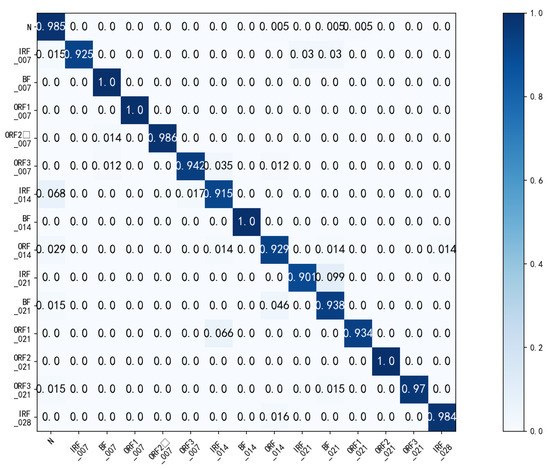 As illustrated in Figure 8, the confusion matrix demonstrates the model’s classification accuracy across various fault types. The experimental results, as shown in Table 4, demonstrate that our Light Recurrent Unit (LRU) model achieved a classification accuracy of 97.14% in the task of bearing fault diagnosis. Compared to other benchmark models reported in the literature [48], our LRU model demonstrated superior accuracy: CNN at 90.46%, MAML at 92.51%, Reptile at 92.63%, and Reptile with Gradient Consistency at 93.48%. Although our model’s accuracy is slightly lower than the more complex and specifically designed EML model (98.78%), the LRU model features a simpler design and lower computational resource requirements, significantly reducing complexity and resource demands while maintaining high classification accuracy. Additionally, our model considers all available fault depths (0.007 inches, 0.014 inches, 0.021 inches, and 0.028 inches), offering broader fault coverage compared to the models in the literature.