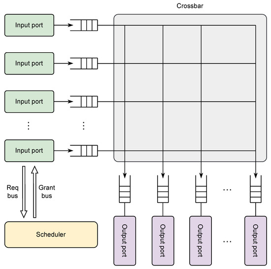 The crossbar switch architecture [18,19], renowned for its non-blocking nature, exceptional scalability, and straightforward implementation, serves as the foundational model in switch design. Figure 2 illustrates a typical crossbar-based switch architecture, which can be roughly divided into the following parts: input ports and associated buffers, crossbar, scheduling unit, and output ports and associated buffers [20,21]. In a network switch, the input and output ports usually handle tasks such as protocol parsing and route lookup. The scheduling unit is typically located at the output port, with the main control unit being the arbiter. The arbiter handles signals related to data arbitration and directs the crossbar to complete data scheduling.