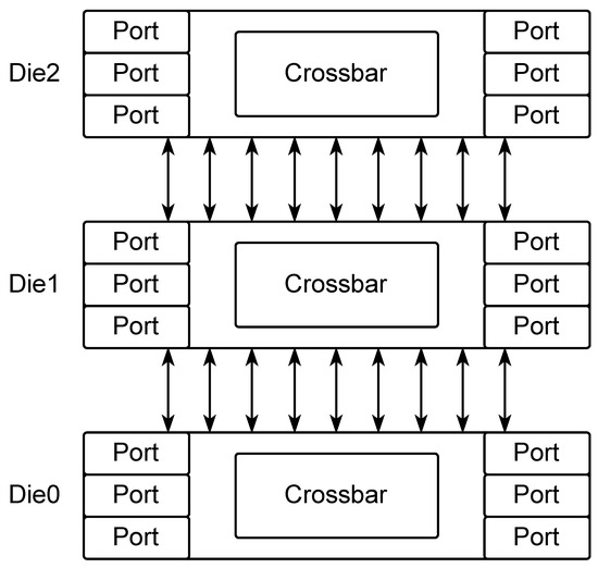 To cater to diverse application needs, multi-die architectures incorporate a wide range of topologies. These topologies are derived and enhanced from fundamental connection layouts to optimize performance. Figure 1 presents a cross-sectional view of a multi-die chip, emphasizing basic connectivity; it showcases how each die is interconnected through a silicon interposer, underscoring the sophisticated design and engineering efforts that facilitate these connections [12,13,14]. This approach facilitates the interconnection of small dies to simulate the functionality of a single, larger chip. Such a multi-die architecture enables the development of switch chips with enhanced port capacities and improved performance, and its adoption has paved the way for designing cutting-edge, high-efficiency switches. Nevertheless, the design of switches employing multi-die packaging [15,16,17] faces notable challenges. In multi-die packaging, the inter-die connection density is significantly lower compared to the intra-die connection density. Since switch applications require all ports to be connected, the inter-die connections become the primary bottleneck as the number of ports increases.This limitation poses a critical challenge, necessitating innovative solutions to optimize data transfer and ensure the seamless operation of the switch.