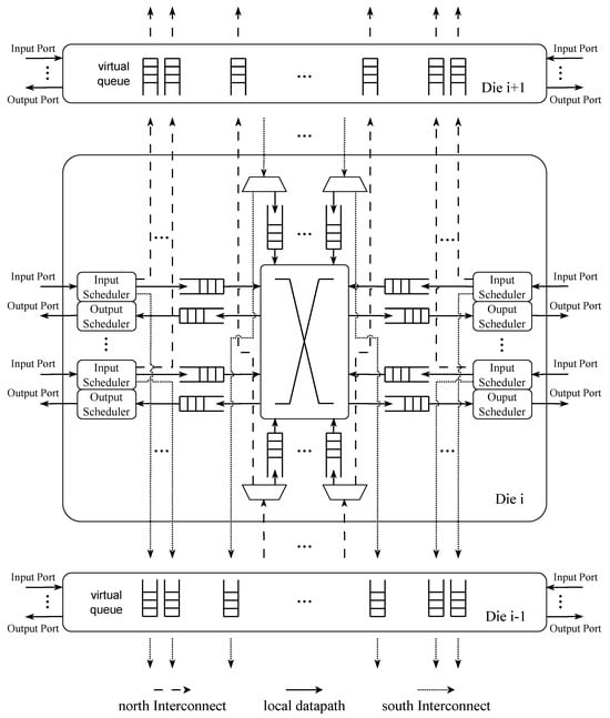 The data flow within the switch architecture is depicted in Figure 5. In this architecture, incoming data packets enter the system at the line rate through the input port and are then processed by the input scheduling module. The input scheduling module divides the input queue into P parts, placing one part on the local die and parts on other dies. After passing through the input port scheduler, data are directed to queues on different dies based on its destination address. If the destination address points to a port on the northern die, it is sent to the northern die, and the same applies to the southern die. When data need to be transmitted across multiple dies, assuming data from need to be sent to , and there is no direct connection between and , the data must be routed through to reach . Upon reaching , the data undergo a demux with the destination address as the select signal. This demux determines whether the data are directly placed into a virtual queue or sent to . This approach ensures that input and output queues are implemented within the same die, maintaining a consistent distance between the input and output queues for each packet. Subsequently, the data in the queue issue a request to the arbiter, and the arbiter scheduling directs the packet to the output queue through the crossbar. Finally, the output scheduling processes and transmits the packet to the output port. The key characteristics of the switch architecture based on multi-die design are outlined below: