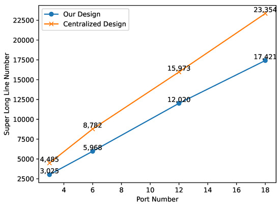 Within the context of multi-die architecture, SLL connections are essential for inter-die communication. To evaluate the proposed architecture’s efficiency in utilizing SLL resources, we implemented and compared both centralized and distributed switch architectures. For each architecture, we conducted separate tests to measure SLL resource consumption across various ports, providing a comprehensive analysis of how each architecture manages SLL connectivity. Figure 7 illustrates the SLL resource consumption for both architectures across a spectrum of port quantities.