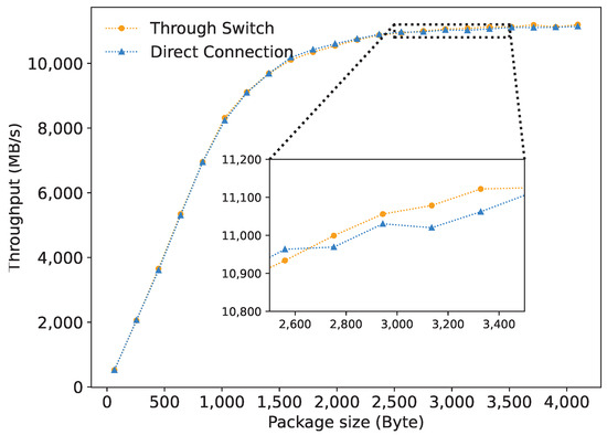To thoroughly evaluate the distributed switch architecture’s performance impact and ensure data transmission consistency between dies, we embarked on a comprehensive series of experiments. Our initial phase aimed to determine the switch’s influence on network performance. To achieve this, we set up two distinct test environments: one where network cards were directly interconnected, and the other where connections were facilitated through a switch. The findings, as depicted in Figure 8, reveal a noteworthy consistency in throughput for both scenarios when transmitting different sizes of data packets. These results reinforce the conclusion that the inclusion of a switch exerts a minimal impact on the network’s bandwidth, thereby underscoring the distributed switch architecture’s capability to sustain robust data transmission with high efficiency.