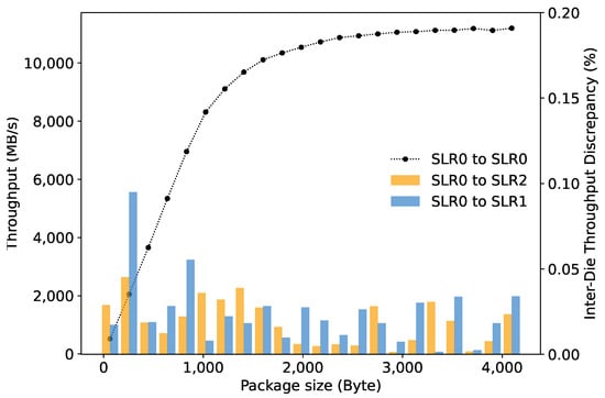 Due to the adoption of a distributed switch architecture, we conducted an assessment of the internal consistency within the switch. This involved configuring the switch’s routing table to examine the uniformity of bandwidth across transmissions between different dies. The symmetrical design of the VU9P chip allowed us to limit our testing to transmissions from SLR0 to SLR1 and SLR2, which was considered adequate for our purposes. By calculating the difference in bandwidth between data transmissions across dies and those that do not traverse dies, we derived the variations as depicted in Figure 9. The curve in the graph represents the data forwarding bandwidth when both the source and destination ports are within SLR0. The accompanying bar chart illustrates the difference in data forwarding bandwidth for data transmissions that span across SLRs compared to those confined within a single SLR. The results indicate that within the switch, the bandwidth difference between data transmissions crossing SLRs and those not crossing SLRs remains below 0.1%. These differences are consistent with normal network fluctuations and are essentially negligible. This phenomenon underscores the consistency of internal data transmissions in switches utilizing a distributed architecture.