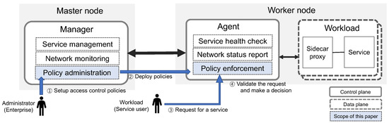 The service mesh control plane consists of a manager and an agent, as shown in Figure 1. The manager, located at a master node, is responsible for service management, network monitoring, and policy administration, while the agent, located at a worker node, performs health checking, network status reporting, and access control policy enforcement. Since this paper focuses only on the access control function, we provide more detail on the relevant features of the control plane.