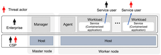 Malicious CSP. The malicious CSP has all the permissions to access the underlying resources of the hardware infrastructure used by the enterprise. That is, the attacker has access to both worker node hosts, including root privileges, and master node host access rights. Furthermore, he/she can obtain the API keys and secret values of the system established by the enterprise. As a result, the attacker can attempt unauthorized access to their desired workloads by bypassing the enterprise’s access control using legitimate permissions.