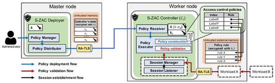 In a master node, S-ZAC has a Deployer that is responsible for policy management and deployment. It provides a user interface for an enterprise administrator to create and manage access control policies for each worker node. The deployer then transfers the access control policies created by the administrator to the controllers in the worker node. The deployer maintains a configuration of all workloads running in the cluster for the purpose of distributing access control policies. Cluster information is periodically updated through administration and management tools.