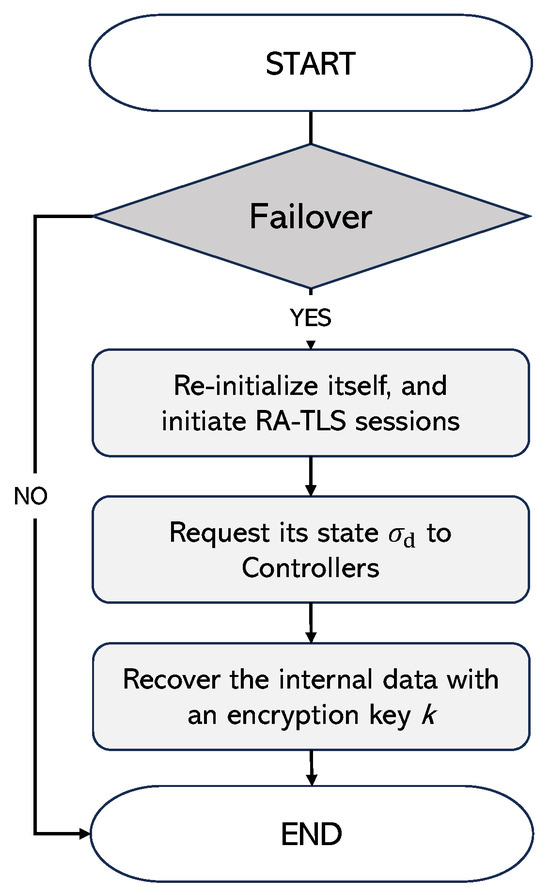 Like this, the persistence of deployer’s state, , can also be ensured by distributing it to controllers over secure channels. Since the deployer holds all the controller’s states, also contains the information k necessary to recover those states if the deployer fails. For efficiency, we choose to store the controller’s states in the deployer’s persistent storage in encrypted form. The information k is used as a secret key to encrypt the state information.