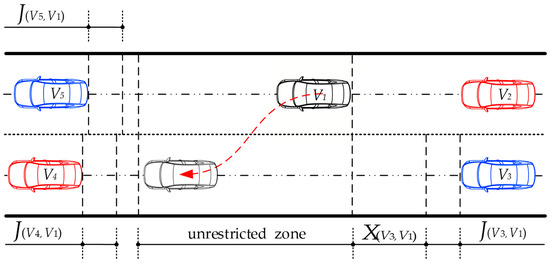 The scenario where AVs meet the conditions for direct lane changing and do not need to send a sharing request is shown in Figure 5. e is an AVs, and is a shared car. is not in the exclusion zone of the two vehicles in front of it. At the same time, the distance between and is greater than the sum of the lengths of ’s exclusion zone and ’s shared zone, i.e., is in the unrestricted zone, which is judged using Equation (2). does not accelerate or decelerate, and the vehicle in front does not decelerate or accelerate. does not need to send a sharing request to .