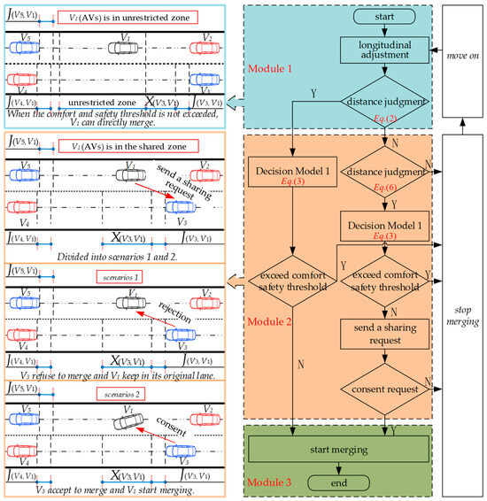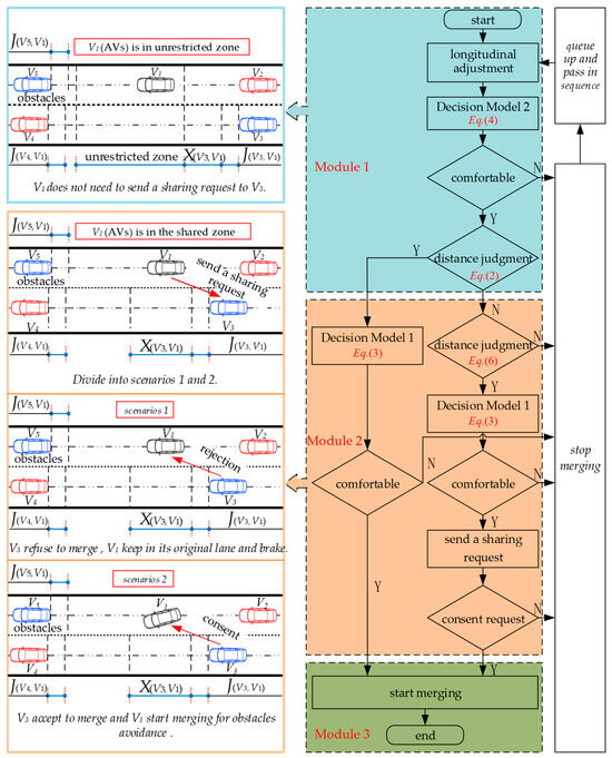 Module 1 of Framework 1 is a stage of longitudinal adjustment for AVs, and it determines whether the remaining lanes can be merged directly. Suppose the conditions for merging the remaining lanes directly are met. In that case, it is still necessary to determine whether Decision Model 1 (Equation (3)) in Module 2 exceeds the pre-set comfort and safety thresholds. If the pre-set comfort and safety threshold is not exceeded, AVs can change lanes; otherwise, importing stops, and AVs go ahead and wait for the next opportunity. If the conditions for merging the remaining lanes directly are not met, it is still necessary to determine, through Module 2, whether the spacing of the safe import into the remaining lanes is exceeded by Decision Model 1 and whether the pre-set comfort and safety thresholds are exceeded. If it is at a safe pitch and does not exceed pre-set comfort and safety thresholds, a sharing request can be made to the shared car. If the shared car agrees to the request, AVs can perform an interchange; otherwise, they stop merging, and the AVs move on and wait for the next opportunity. Framework 2 adds Decision Model 2 (Equation (4)) compared to active lane changing, which determines deceleration or turning to avoid obstacles based on comfort.