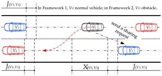 The scenario where AVs meet the lane-changing conditions but need to send a sharing request is shown in Figure 6. is an AVs, and is a shared car. is not within the exclusion zone of the two vehicles in front of it. The distance between and is less than or equal to the total length of ’s exclusion zone and ’s shared zone, and greater than or equal to the length of ’s exclusion zone, judged according to Equation (6). does not accelerate or decelerate, and the front car does not decelerate or accelerate. When making the final decision to change lanes, needs to send a sharing request to .