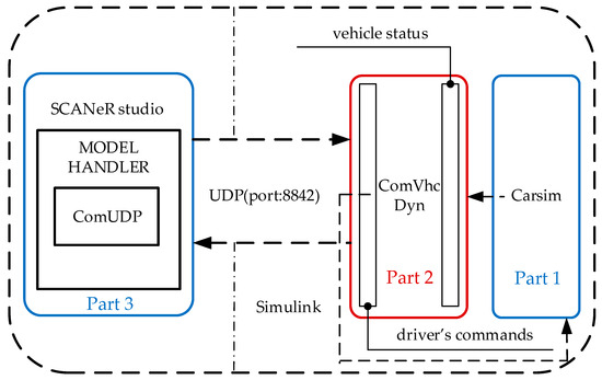 Simulation framework. Part 1 receives the driver’s commands as an input, and it outputs vehicle status data; these data are then used as the input for Part 2, along with complex driver commands, including lane-keeping and lane changes for vehicles. The vehicle status data are also sent to Part 3 for interaction via the ComUDP protocol. Part 2 processes this information and outputs driver commands, including steering, throttle, brake pressure, and vehicle position. These outputs are also the output of Part 3 for further control or display. Part 3 provides scene information, including road information, sensor data, and scripts for controlling a shared car.