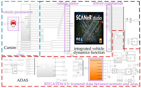 The more detailed explanation of Simulink (Part 1 and Part 2) in Figure 7 is shown in Figure 8. Carsim provides vehicle status data (yaw angle, pitch angle, roll angle, etc.). The ADAS mainly includes models such as road right, Decision Model 2, and Decision Model 1. The integrated vehicle dynamics function is ComVhcDyn in Figure 7, generating some driver’s commands. Finally, since the sensor detection of obstacles is required in simulation verification, RTGATEWAY is used as the transmission bridge for sensor data.