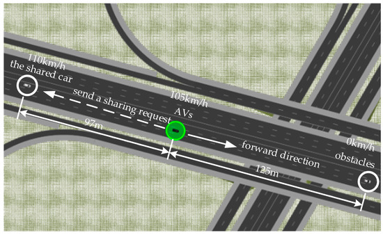 As shown in Figure 13, based on the SCANeR studio scenario, the following road conditions are deployed. The speed of the AVs is 105 km/h, and they are driving normally in the middle lane. At this time, when encountering a faulty vehicle 125 m ahead, the AVs can choose to brake to avoid obstacles or change lanes to avoid obstacles. The shared car is controlled using SCANeR studio scene scripts to keep the AVs within the shared zone of the shared car.