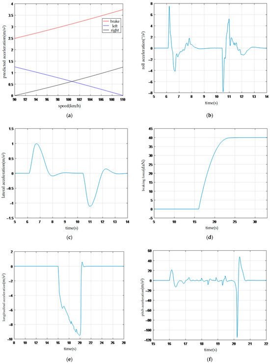Vehicle dynamics parameters: (a) Decision Model 2; (b) roll acceleration; (c) lateral acceleration; (d) braking force; (e) longitudinal acceleration; (f) pitch acceleration.