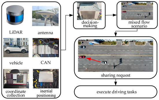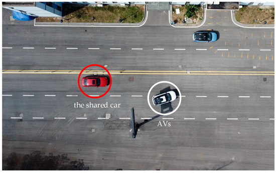 The description of road rights in mixed-flow scenarios is shown in Figure 2. is an AVs, and is a shared car. needs to divide the surrounding road rights into four traditional vehicles, , , , and , before changing lanes. represents the length of the shared zone between and , and the road rights belongs to . is the legal exclusion zone for , is the legal exclusion zone for , is the legal exclusion zone for , and is the legal shared zone for . can decide whether to share with , according to preference.