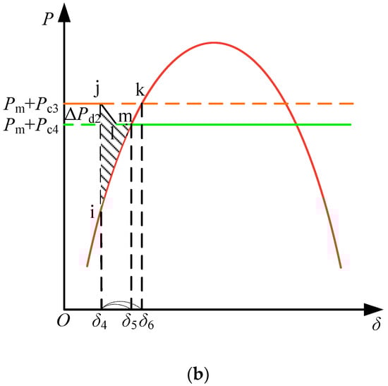 During the power angle swing back, as shown in Figure 2b, if the DC operating power is not changed, the acceleration area will be the curved triangle i-j-k, and the maximum power angle of the generator’s swing back will be δ6. If DC power reduction measures are taken during the power angle swing back, the acceleration area will be enclosed by i-j-l-m, and the minimum power angle of the generator’s swing back will become δ5.