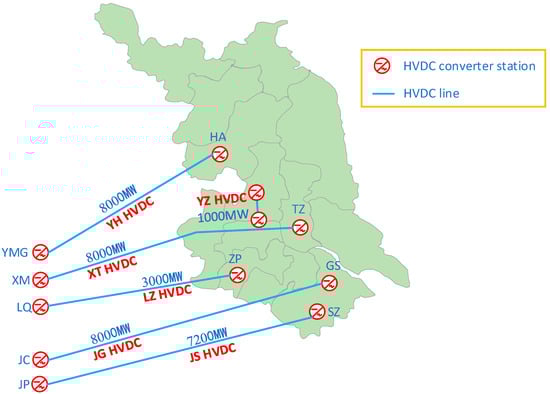 The flexible controllability of High Voltage Direct Current (HVDC) transmission has fundamentally altered the dynamic characteristics of AC-DC hybrid grids compared to traditional power systems [1,2]. Taking Jiangsu Power Grid as an example, during the “14th Five-Year Plan” period, Jiangsu Province accounted for approximately 35.5% of the total load in East China, ranking first among the four provinces and one municipality in East China. Jiangsu is a significant load center in the East China Power Grid, characterized by heavy provincial loads, substantial electricity demand, a compact grid structure, and a dense concentration of flexible AC-DC transmission equipment. As multiple DC lines feed into electrically close AC buses, the operational characteristics of the receiving-end AC-DC hybrid grid represented by Jiangsu Power Grid will become even more complex [3,4].