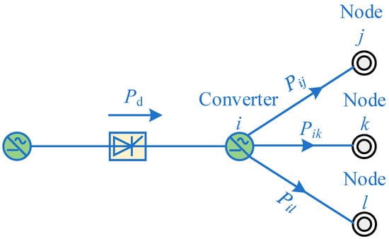 To analyze the impact of different DC transmission powers on the power flow decentralization of AC evacuation corridors at the DC receiving end, the power flow decentralization sensitivity index is introduced. As shown in Figure 4, let Pij denote the power flow in a certain AC evacuation corridor ij before DC power adjustment, and let Pij’ represent the power flow in the same corridor after the DC power change. Given a DC power variation of ΔPd, the power flow decentralization sensitivity δij of this DC with respect to the AC evacuation corridor ij can be defined as: