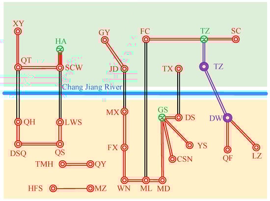 To align with practical engineering, this article establishes a model of a provincial power grid in China within the ADPSS Simulator, a hybrid electromagnetic-electromechanical simulation program for power systems. This model incorporates the entire province’s power system as well as portions of adjacent provincial power systems represented as equivalent networks. The model comprises 3591 stations, 866 generators, 11,537 buses, 3301 transformers, 10,006 AC lines, 10 DC lines, and 3886 loads. All DC lines shown in Figure 3 utilize electromagnetic transient models to guarantee accuracy.