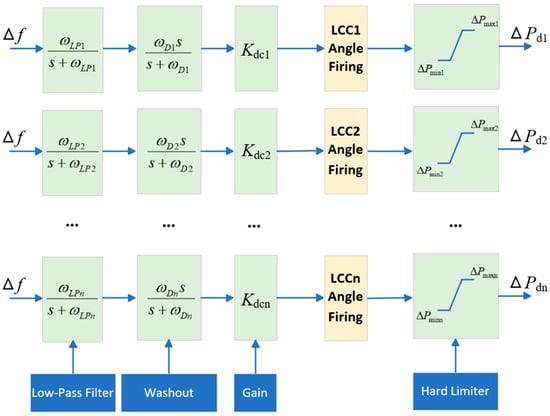 The control diagram of each HVDC is presented in Figure 6. Here, the low-pass filter is used to filter the noise and the washout component is used to ensure the control will act only if the frequency is fluctuating. The subscript 1 to n of each ωLP and ωD denote different HVDC’s parameters. Especially, the hard limiter ΔPmaxn and ΔPminn of the controller has considered the short-term and long-term overload capacities for each HVDC, which is according to Table 4’s results.