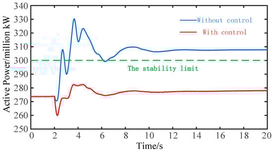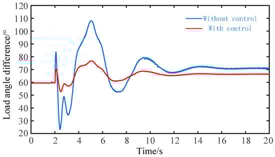 According to the above strategy, a comparison of the load angle difference response curves between the HS power plant and the YZ power plant without and with the DC power support strategy is shown in Figure 7. As can be seen from the figure, taking appropriate emergency power increase and reduction measures after a DC locking fault can significantly suppress the swing amplitude of the power angle difference between the units on the south and north of the river, improving the transient stability margin of the system’s load angle.