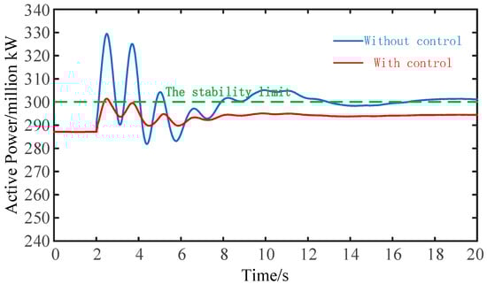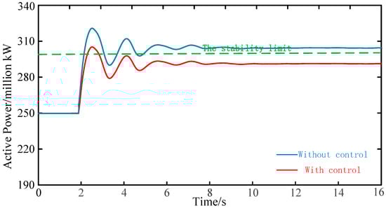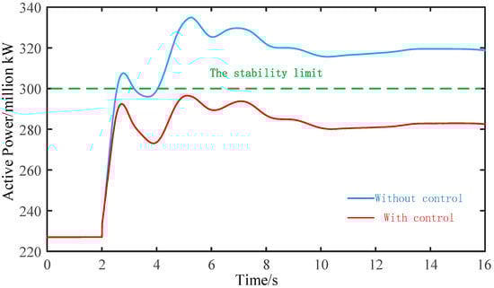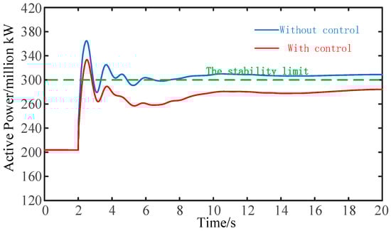 The comparison charts of active power response for the three river-crossing channels, namely QT-QH, SCW-LWS, and FC-ML, without and with the DC power support strategy are shown in Figure 8, Figure 9, and Figure 10, respectively. According to the charts, compared to not adopting the power support strategy, implementing appropriate emergency power supports and reductions after a DC locking fault not only improves the swing amplitude of the load angle difference between units on both sides of the river but also suppresses power fluctuations in the river-crossing channels. The active power of the three river-crossing channels is 2.94 million kW, 2.78 million kW, and 2.82 million kW, respectively, all below the stability limit of 3 million kW, indicating that the risk of exceeding the limit in the river-crossing channels has been mitigated. This improvement is due, on one hand, to the power support from the South Jiangsu DC, which compensates for the power shortage in the South Jiangsu power grid, and, on the other hand, to the power increase of the YZ DC, which shares the active power load with the parallel AC channels.