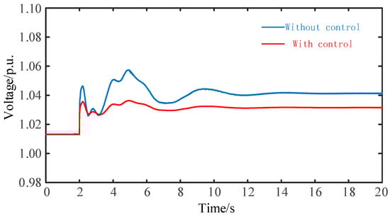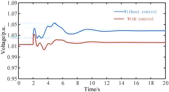 The comparison of voltage curves for a 220 kV DS busbar and a 500 kV DS busbar, without and with a DC power support strategy, is shown in Figure 11 and Figure 12, respectively. According to the analysis of the charts, due to the emergency power supports of multiple DC lines, the surplus reactive power in the nearby grid at the receiving end of the locked DC is absorbed, bringing the voltage level of the receiving grid closer to the rated value.