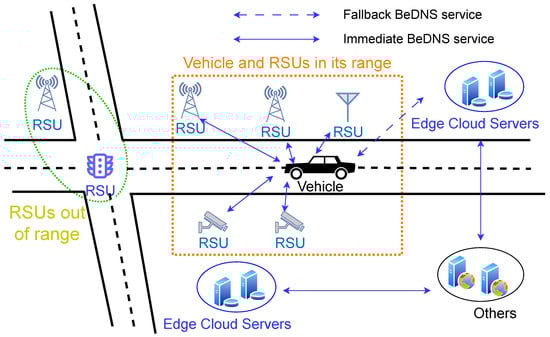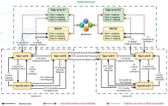 - Vehicle-to-vehicleThe Type IIA units on two different vehicles establish interaction with the BeDNS service provided by RSUs and/or the edge servers as shown in Figure 4. This is the most complex interaction in the system, which will be described in detail in the implementation section.