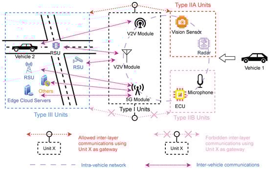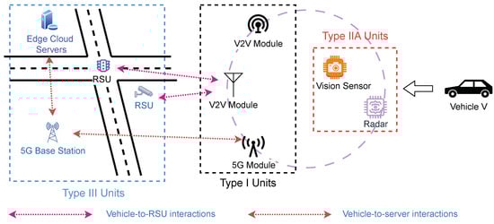 - Inter-layer interactions refer to interactions that combine the two types of previously mentioned interactions, involving RSUs, edge servers, vehicles, cloud servers, and Type I/IIA/III units. The proposed interactions can be categorized into three types specifically: (1) vehicle-to-RSU, (2) vehicle-to-server, and (3) vehicle-to-vehicle.