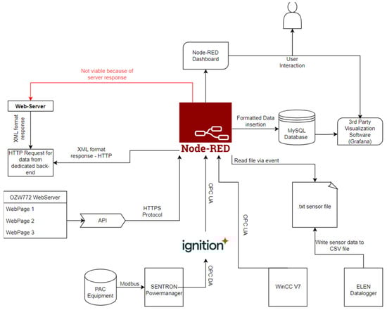 Figure 5 depicts the overall architecture with consideration of the connection between certain modules of the system. The main entities that construct the IIoT network are the web servers, which can be defined as data source systems, the Node-RED module, acting as the main IoT platform that hosts the entirety of the logic behind the operations, the database storage facility, and, lastly, the visualization modules, which permit the observation of the acquired data.